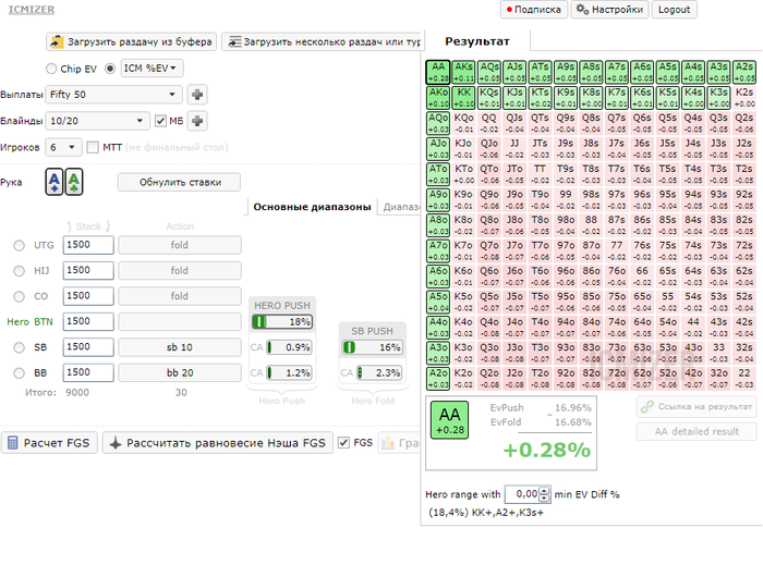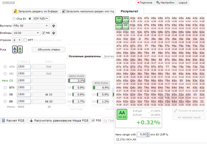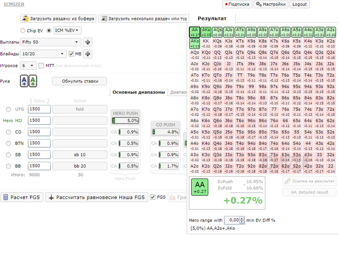 Evgeny_Zahovaev @ 17.10.2014 Доброго времени суток, уважаемый разработчик программы Icmizer. С удовольствием использую вашу программу для улучшения своей игры. Возник один вопросик, надеюсь в нем разобраться. Итак, для анализа пуш/фолда на финальном столе 90/180 макс турнира я использую спектры FGS равновесия Нэша. Загружаю руку из HM, и нажимаю "Расчитать равновесие Нэша FGS" Программа выдает спектр: Пример 1