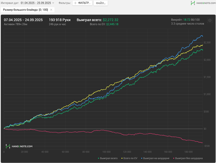Играл себе 200-1к со средним винрейтом ~7, все было прекрасно. А потом хуяк и все полетело в бездну, первые месяцы ЕВ еще держалось, но вскоре тоже полетело в пропасть. С пика я проебал более 250би(будем считать пло200, тк больше всего экшена пришлось на него), спустился до пло50, а длилось это 1.5 года. В месяц игралось 50к рук в среднем.