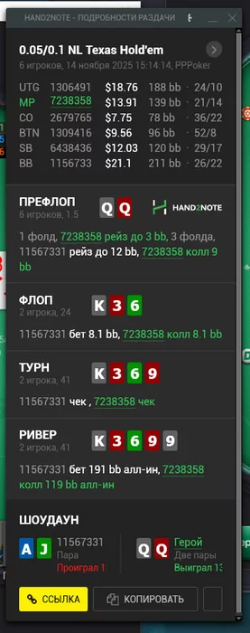 В моменте смутил ч-ч тёрн, 9-ток я в 3бете вижу мало, KK AK KQ он бы не стал чекать этот тёрн, овербет 3 банка по таймингам был - инста, хотя после шд - я понимаю что 9тка там быть могла редко, у человека 3бетящего AJo vs mp)