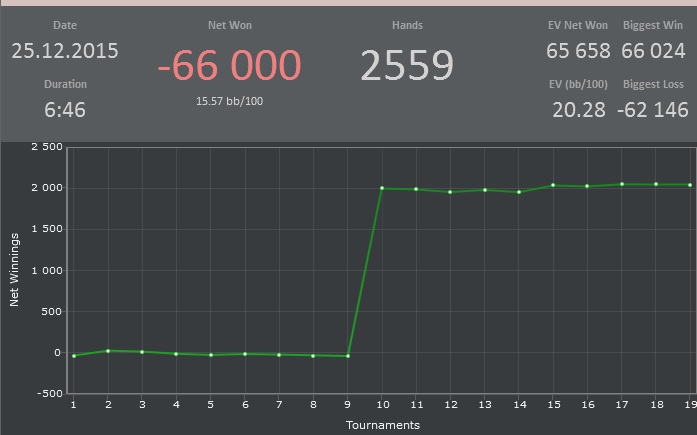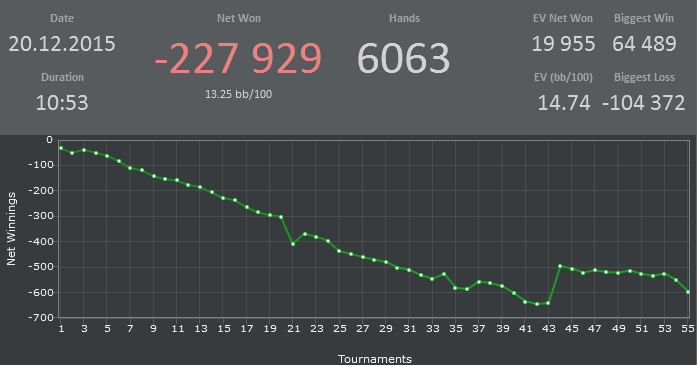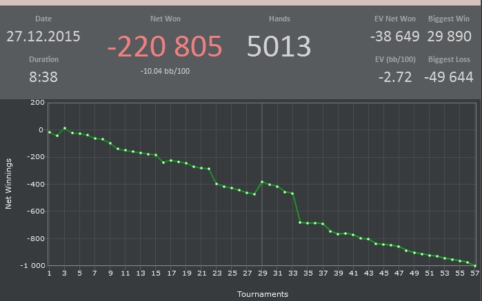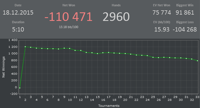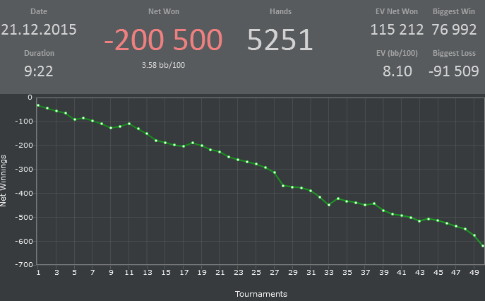 Rock @ 22.12.2015 Марафон. Итоги: Уложился в 37 дней(~220часов катки)... Для себя понял, что 1к турниров в месяц вполне реальная задача... И я бы сказал довольно таки интересная... По результату марафон устроил, но в общем отложилось, что отыграл по качеству в районе самого низа своей игры... Возможно это лютый ап, возможно даун, а может все "по чесноку", одно я знаю точно- играть я могу намного лучше и над моей каткой еще работать и работать... Я надеюсь это кому-то поможет, а кого-то, возможно, повеселит: Этот марафон дал много нового опыта и знаний, добавил уверенности в своих силах. Не сказал бы что это было изи или что-то в этом духе... Каждая сессия была борьбой в первую очередь с самим собой, временами эта борьба превращалась в настоящую войну! В баталиях которой моя берсерк версия пыталась сделать все возможное чтобы усугубить ситуацию... Думать над сдачами?! Нееет! Мы будем делать все инста и под видом нормальной адекватной катки будем хуярить в берсерке по кнопкам надеясь что нам наконец начнут сдавать! И крича "Хуесосы!" "Вы днари ебаные а не реги" винить во всем диспу и мудаков регов, которые делают минусовую хуйню и им вечно доезжает! НО НИ В КОЕМ СЛУЧАЕ НИ СЕБЯ! Нет это точно не эта ебанутая обезьяна перед двумя мониками, которая в берсерке хуярит по кнопкам, виновата! Это все рег, который без позы в 3бет пот задефил хуйню все он... Или этот недорег у которого пушбот даже не пощитан и он нас закрыл слишком широко и ушатал... Мааамаааа это все онииии!!! Когда находишься в этом состоянии, зол на весь мир, готов ломать все вокруг, благо недостаток средств останавливает ибо не на чем будет катать... Так бы уже давно открыл счет мониторам... Мы так устроены, что помним негативные моменты связанные с каткой намного лучше и склонны во всем винить диспу... А ничего, что она и относительно слабые поля в МТТ нам прощают каждый день весь наш аутизм о котором мы даже не вспомним, а потому, что прохуярили трипл баррель без эквити на структуре оппа с планом на раздачу "фолд плиз" и он поверил и скинул... Открытия с Q2o с EP на финалке "Бля да я чипак нахуй! Ща я буду давить!" тоже прощает... К чему я это все, по моему мнению нет людей, которые играют идеально в покер... Все ошибаются, а в МТТ так тем более, поскольку реально многое прощают. И каждый раз, когда тебя ушатывают воспринимай это как должное... Сегодня так, в след раз будет по другому, не факт, что лучше, не факт что хуже, ЕСЛИ ТЫ НИЧЕГО НЕ ИЗМЕНИШЬ... Играй меньше столов, думай больше над раздачами, не АФКаш... Мы всегда склонны винить диспу, но на деле играем как дерьмо и ничего с этим не делаем... Всегда будут ситуации когда недодумал, недосмотрел, заафкашил, не увидед выгодную ситуацию, отвлекся, да что угодно, ключевое в этом во всем- это ТЫ и только ты сыграл не лучшим образом! Почти в каждом турнире можно найти выгодные ситуации для распиха или даже для победы, но для этого ТЫ должен, просто обязан стараться и никогда, повторю еще раз, НИКОГДА НЕ СДАВАТЬСЯ! У меня была финалка 11 фриза на которой в 9максе я остался после АК<QQ с 2.5бб и я не сдался! У меня просто не было другого выбора в тот момент, мне настолько нужен был топ 1, что я распихался и таки взял его! И знаете что я не так уж и часто вспоминаю об этом, хотя каждую сессию у меня бывают стеки меньше 5ББ и я просто похуйвпушу по нешу и будь как будет, вместо того, чтобы проанализировать ситуаци