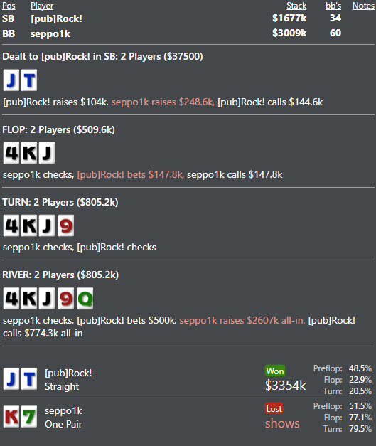 Хай гайз! Давно не писал, каюсь... И сейчас не стану писать много- нужно собраться с мыслями... А это просто оставлю здесь: Бест кэш. Был вариант поделить когда опп чиповал 2к1му, но он зажал жалкие 70 баксов. Пришлось отобрать 1к... После этой парень поплыл...