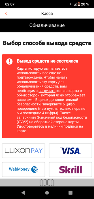 Я пишу им уже в грубой форме,кидаю еще раз текст ошибки, ещё раз скрин и говорю разберитесь!!! Через неск часов приходит письмо,мы передали вопрос в соответствующий отдел. Окей, через почти сутки приходит долгожданное письмо от службы с текстом : ваша карта полностью верефицирована,с нашей стороны все подтверждено. Захожу вывести,выдает ту же ошибку,типо подтвердите карту, охиренные ответы. Они ждут типо я тильтану и проиграю их и тянут время,или что???? Я сейчас написал им ещё раз, разберитесь,уверен на 95,5% что через сутки ответ будет примерно тот же типо карта верефицирована с нашей стороны проблем нет) збс,как получить деньги? Сумма то смешная 50$,я понимаю если бы тысячи,но тут.... Если бы была с моей стороны проблема,то писался бы другой текст наверное? Типо у вас что то с картой, банком и тд.не понимаю Если представитель прочитает это,ник Andrew1925,хотя наверное отправит на почту меня,где мне напишут ваша карта верефицирована и так по кругу)
