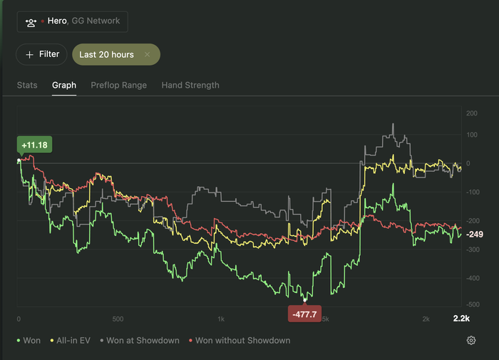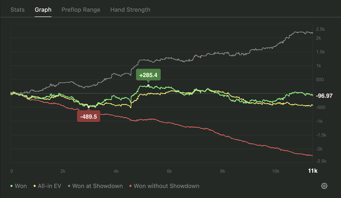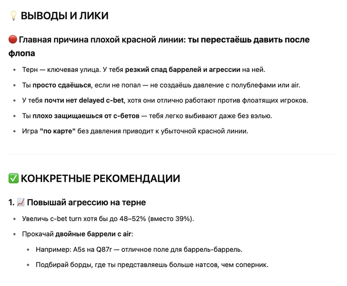 Поэтому сегодня я маньячил. В первой половине сессии засадил как минимум несколько стеков разного размера блефами тернов и риверов. И блефов еще повскрывал неудачно. Думал, что закончу сессию в какие-нибудь -500бб по ев и даже успел пожаловаться чатугпт. Но, к приятному моему удивлению, вышел почти в ноль по ЕВ, а красная в приличные -11/100. Похоже стратегия агрессивной игры действительно окупается 😄