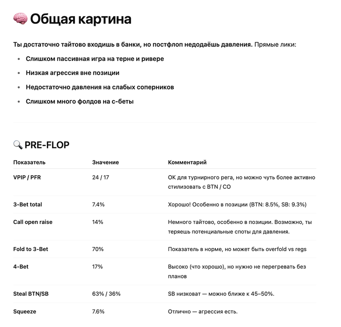 Чатгпт сказал, что я нит и мне нужно повышать агрессию, забирать банки без вскрытия — ставить тёрн и ривер, чек-рейзить флоп, больше блеф-3бетить и тд.