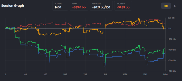 По кассе около -100бб, притом, что за 2к рук еще рб насыпали около 70. Получается чистого профита -170бб😒и это прискорбно. Но как понимаю, тут за сессию можно быть в плюсе на 250бб, а так и в минусе, а может это еще не предел.
