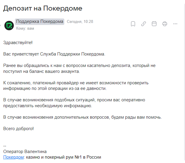 Что делать, если завис депозит? Подождать 1-2 часа. Обратиться в чат тех. поддержки Покердом или написать на почту и прислать чек в PDF формате и выписку в PDF формате за дату платежа.