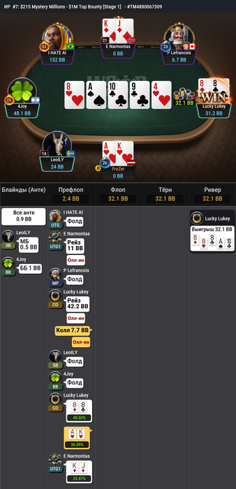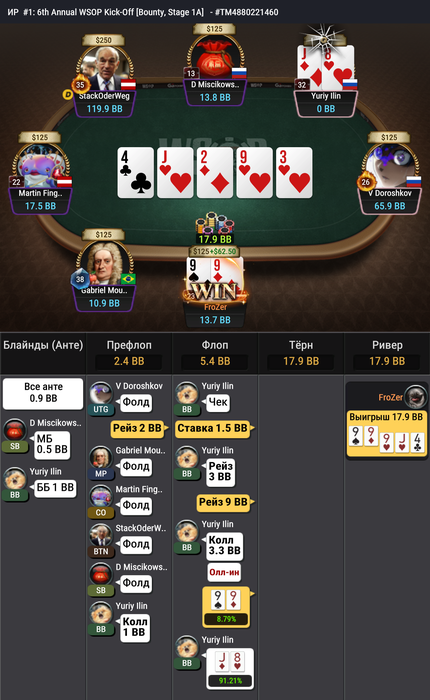 Во WSOP'ы сыграл 4 прохода. Чуть ли не в каждом поднимался до нескольких стартовых, но в самых нужных оллынах не складывалось. Один проход в результате сделал — в #7: $215 Mystery Millions пронёс 6 стартовых стеков — 150к.