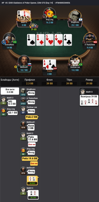 Но, к сожалению, здесь не смогли с QTs обыграть ТТ за 250$ нокаута и 83s за удвоение почти до среднего стека.