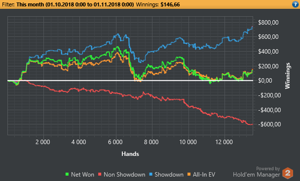 Привет, напишу краткий отчетик октября. В общем, завалил я весь челендж, дистанцию не откатал. Напрягает меня нулевая игра, хочется все выше, выше играть, а толку ноль, весь год топчусь на месте. Надоело пытаться выдавить какой-то результат. Итого было принято решение вывести бр и начинать проходить лимиты с нуля, и по ходу активно обучаться, чтобы откатившись назад, затем сделать большой рывок вперед. Посмотрим для какого лимита я гожусь. Бр 60$. Привет нл2. Реги, берегитесь!)