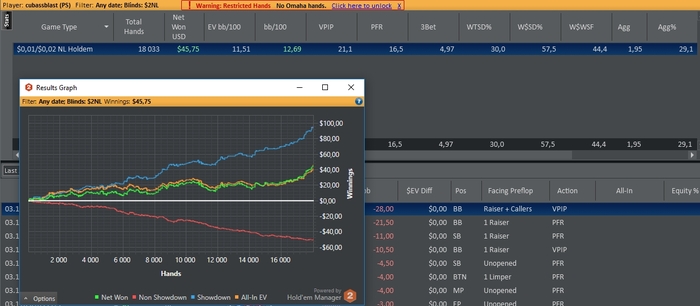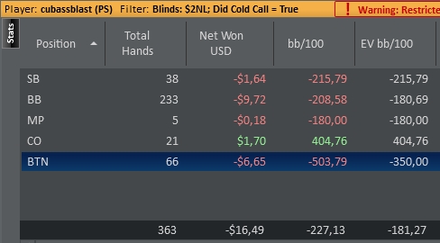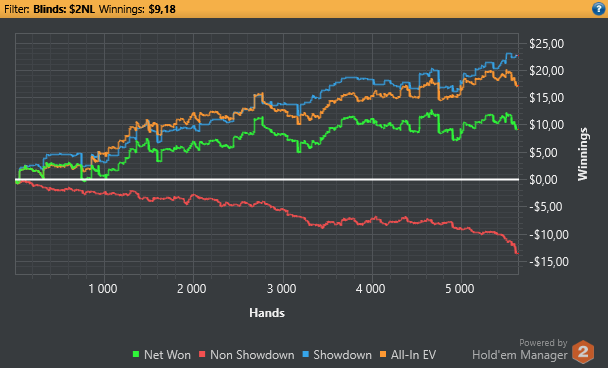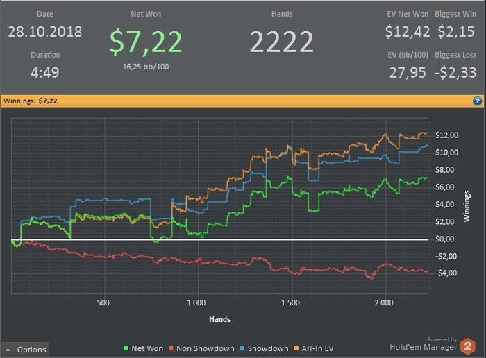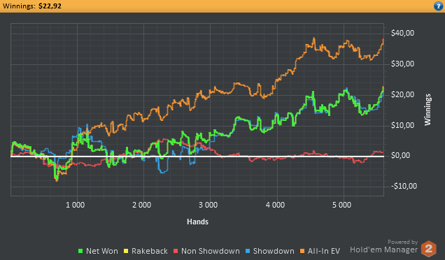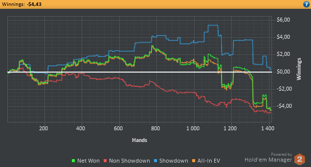 Сегодня напорол херни, короче стрельнуло мне в голову на красную поиграть, поблефовать, в итоге блефанул с мусором в оппа, который не падает на 3беты вообще, и на посте тоже не сдается и еще и тильтанул против него. Начал дальше 3бетить и поливать, но оппу пох, у него всегда найдется натс. Вот так на графике образовался водопад, где я с +100$ улетел сразу на -300$. Еще хорошо, что хоть как-то отмазал. Завтра хз удастся ли покатать. Ну а в субботу точно выходной.