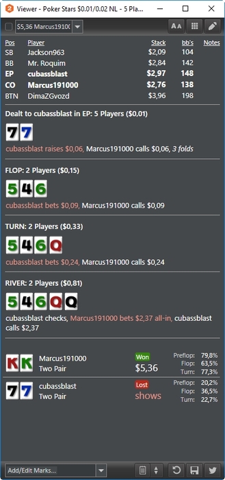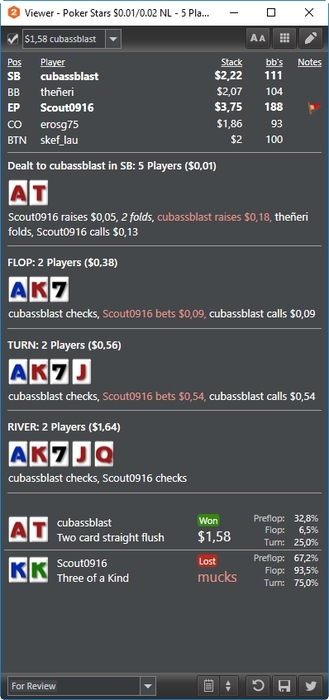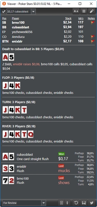 До этого катал 4 стола, пытался вдумываться в раздачи, поэтому больше столов не тянул. Щас играю 6. Все-таки заниматься разбором раздач во время игры у меня не очень получается, лучше уже разобрать ситуацию вне игры и открыть больше столов. Например, взял ситуацию бтн вс бб, борд Jh8h4s. И у себя в голове перебираю свой диап, смотрю какие руки у меня есть. То же самое рассматриваю диап оппа. Потом беру конкретные типы рук и рассматриваю различные варианты розыгрыша и бет сайзингов, представляю с чем мне опп будет платить и сколько. Думаю как бы я здесь хотел сыграть вс фд, как вс ТП и т. д. Флопзилла это конечно хорошо, но у меня все равно мало что откладывается в голове после разборов, а вот когда я сам перебираю руки в голове и варианты розыгрышей, то развивается визуализация и ситуация хорошо запоминается в виде образа.