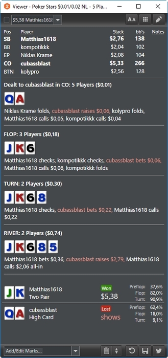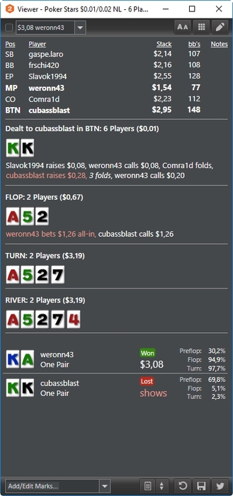 Сквизанул КК и увидел на борде А. Сразу вспомнил раздачу в соседнем блоге, где фиш пушнул шлак на подобной доске с тузом. И как раз он пушит, я даж секунды не подумал, жмякнул турбо колл с мыслью нахера тебе туза пихать. И на тебе, у него туз)) Ну просто полный рандом, логики нету, короче сдавайся и жди флоп без туза)