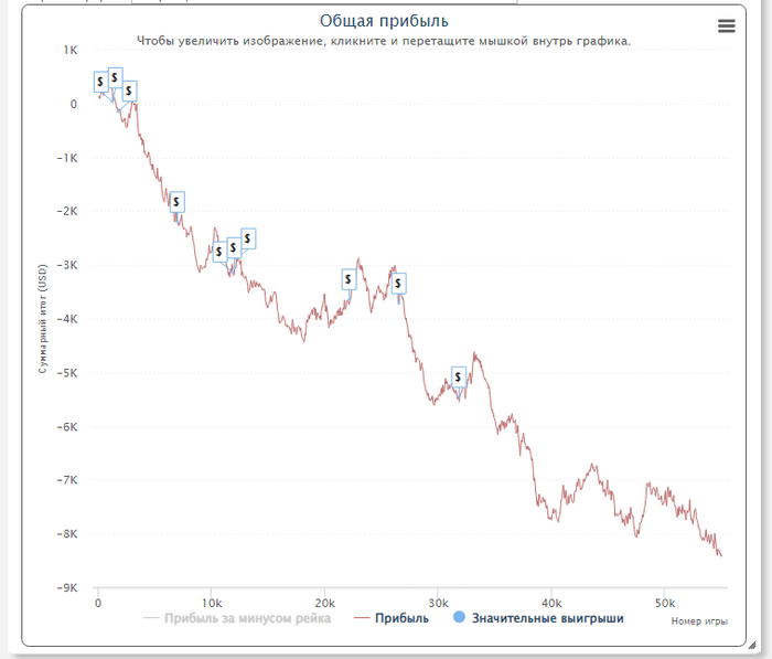 Вот так выглядит график другого гриндера лидербордщика. В это сложно поверить, но с учетом РБ он отыграл в плюс около 10-15к 🙈