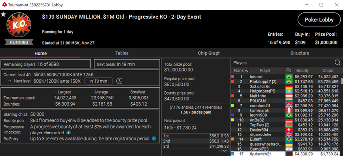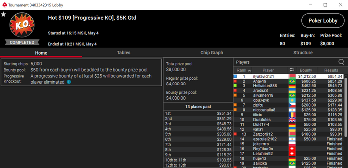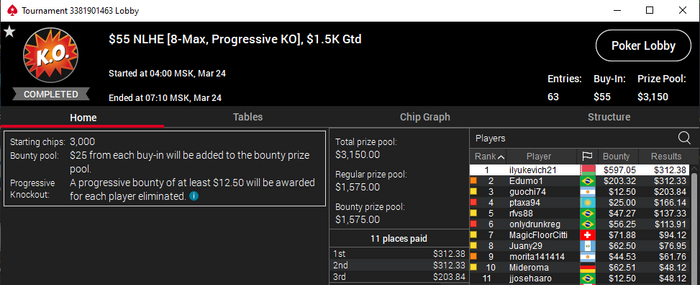 Дальше уже играл в обычном режиме. Садился за столы в 4-6 утра по МСК и грузился до 7.30-9.30. Отыгрывал в день до 20 туриков и дальше старался за столы не садиться, хотя не раз подгружал по пару турниров под дотку))