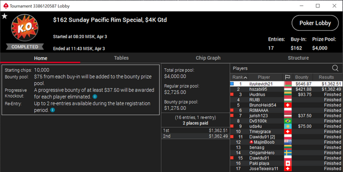 Сегодня было в планах откатать последнюю сессию с туриками до 215 и бежать гриндить ночь, утро или день на аби 35, но как не ожиданно, начало воскресенья порадовало. Прыгнул в 2 турнира пацифика 109 и 162 и в 1 удалось выиграть снгшку на 2 стола.