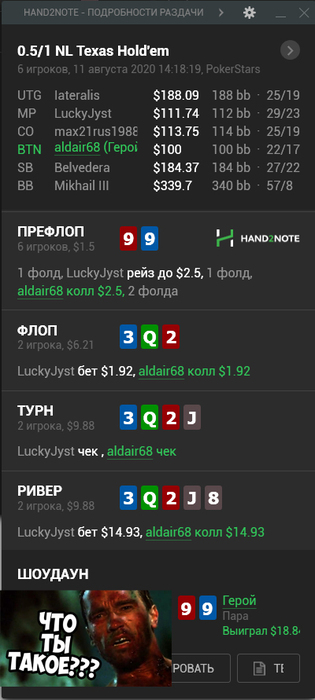 Джентльмены, всем привет) Решил вас немного развлечь Объявляю конкурс - тому кто угадает руку оппонента - приз. Каким будет приз я не расскажу, но он скорее заинтересует тех, кто играет лимиты до нл50. Впрочем, если кто-то с нл50+ победит и захочет воспользоваться призом, то я тоже возражать не буду. Присылайте свои предположения в комментариях. Масти руки не требуются, только номинал. Если никто не угадает точно, то приз получит человек, который был наиболее идейно близок) Поехали)