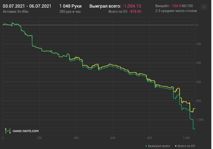 Мне повезло, я достаточно неэмоциональный человек и сегодня во время сессии при -100$ и очередном проигранном банке сказал что-то вроде: «господи, ну что это такое? Как в такой покер играть-то?». На этом все и продолжил катать) закончил вроде в -80, играл бы и дальше, но столы закончились и что-то новой игры особо не находилось.