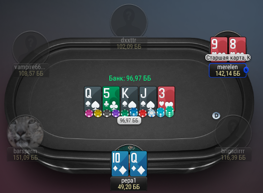 LittlePig, все ж просто, ты дала оппу реализацию, вместо выбивания его эквити с рукой шдв и без понимания типа оппонента. Знай ты, что это агрессивный опп - ок. Сыграно нормально. Без информации - херня.