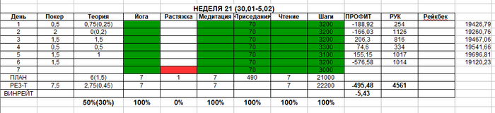 Тут я решила отказаться от просмотра результатов как сыграла за день и от плана по теории. Оч давит когда садишься катать и думаешь о том что пару дней играешь в минус пару баинов, начинаешь фолдить из-за этого все, меньше блефовать, вообщем играешь неоптимально. Решила смотреть в кассу тока в конце недели и количество рук записывать за все сыгранные дни.