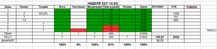 Поняв что много дел я не вывожу, решила отказаться от плана скока часов я должна катать в неделю, но оставить план по теории и ренджам. Еще я поняла что физически плохо себя чувствую, все время ноги были забитые какие-то( наверно сказались 100 приседаний в течении 14 дней) и я решила снизить норму до 70. Вообще в целом почти 3 недели я чувствовала себя нехорошо: меня стало больше шатать при ходьбе, постоянная слабость, болела голова. Ощущение было что у меня обострение началось, оч состояние было похожее на то что было в августе. И я испугалась пиздец как. Не прошло и полугода как меня скосило. И я поняла что жить по принципу либо все либо ничего больше не могу. Раньше организм как-то лучше переносил нагрузки, а теперь нет и с этим придется считаться и больше отдыхать и не требовать от себя прыгнуть выше головы)