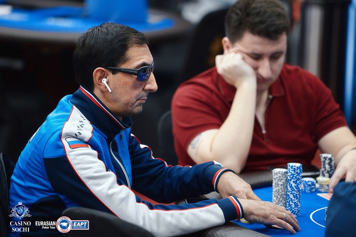 Стол 2. Артем Константинов запушил 100,000 из середины с , Арутюн Саакян уравнял на малом блайнде после долгих раздумий, а Вадим Гайдук поставил олл-ин 400,000 с ВВ с . Саакян выбросил.