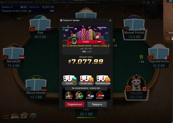 FroZer, извиняюсь что запоздал с вопросов: А какое количество наигрыша у тебя было перед этой серией за последние месяцы? Сколько ты сам работал с теорией? Какой ран имел по паре сотен турниров?