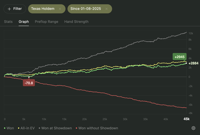Винрейт по ев 7.3/100. Учитывая мой уровень кажется, что у хорошего игрока, плотно поработавшего со стратегией винрейт может быть в два раза выше. Куда красная уходит в таком объеме еще не выяснил, но работаю над этим)