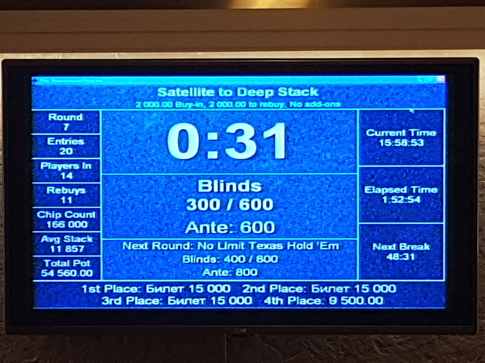 17:15 DEEP STACK по 15 000₽ GTD 600 000₽ - стартовый стэк 100 000 - стэк на Re-Entry 100 000 - поздняя регистрация и период Re-Entry 11 уровней - длительность уровней по 30 мин