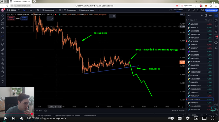 В первом же скрине абсолютно классический сетап "Пробой наклонки", который знает каждый, кто хоть немного изучал тех. анализ.