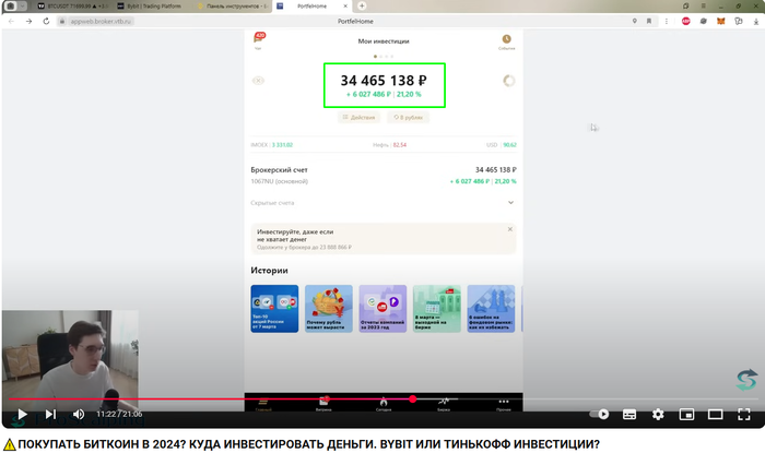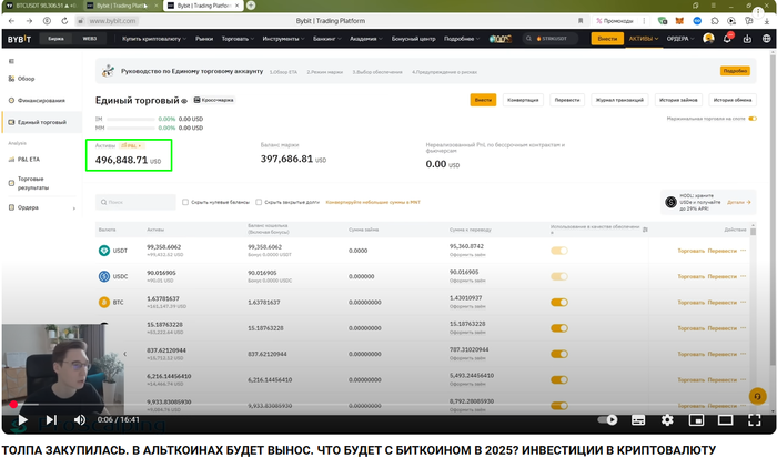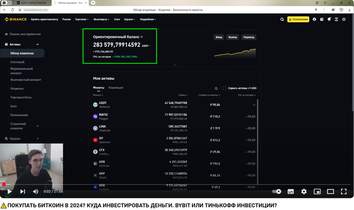 Для тех, кто не может потратить даже 10 минут. Мы открываем последнее видео на его канале, и в нём он сразу же показывает текущий баланс портфеля на Bybit.