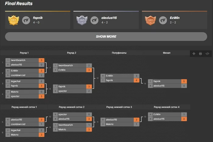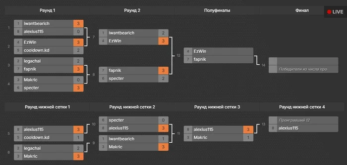 Формат классный: 8 групп по 5 человек, каждый с каждым до 2 побед. Из группы выходил один, потом плей-офф с нижней сеткой, как в киберспорте. Без тупых рандомов и монеток в одну игру — нужно было реально бороться. И да, я это сделал. Прошёл всё и победил.