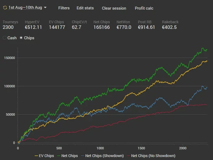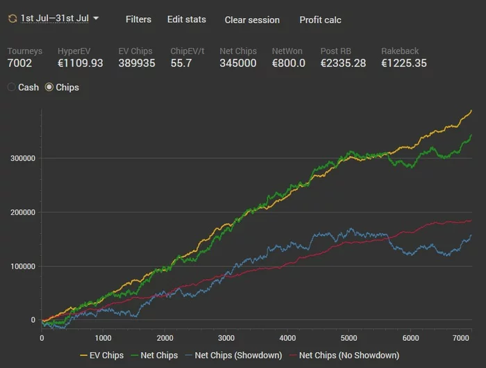 По планам на август: снова 6.5–7.5к турниров. Играю пятёрку, хочется уже в 70+ фишек выйти. А там — видно будет.