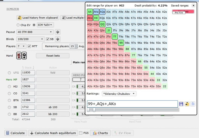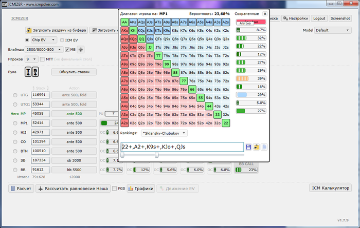 TNG14 @ 18.11.2014 Почему при нажатии на Неш выдаёт один диапазон, а на расчёт немного его изменяет ? (на 2%) И ещё вопрос прога автоматически меняет наш ранжир рук в зависимости от того пушим или колим ? Стоит по умолчанию Скланский, а реально выводит диапазон повер пуш при пуше.