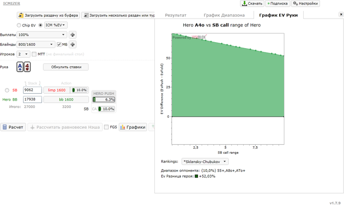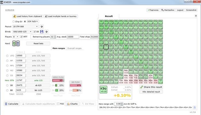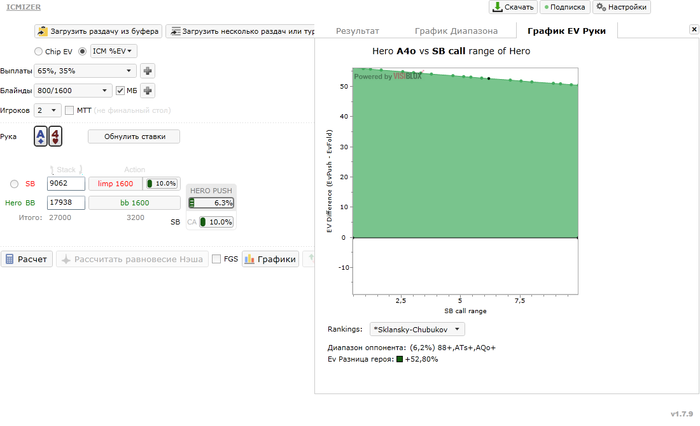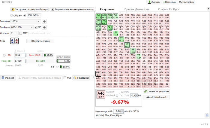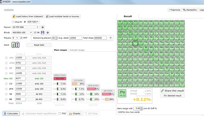 По дефолту, когда у нас пуш/фолд, ИЦМайзер даёт какие-то адовые спектры оппонентам