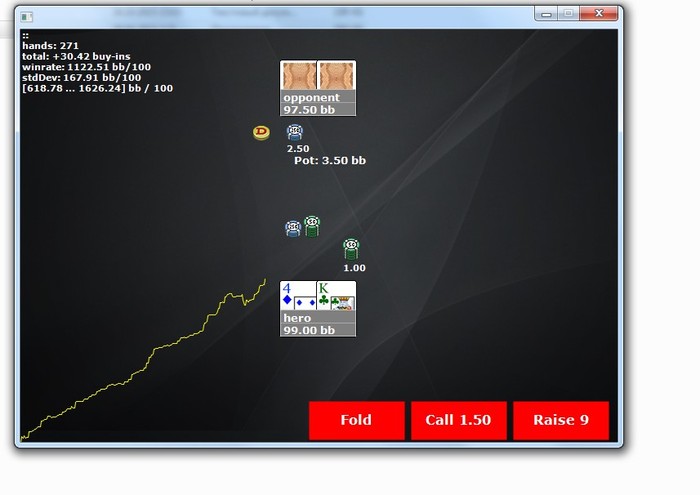 На самом деле я могу уничтожать этого бота с таким винрейтом как я показал на бесконечной дистанции, могу сделать 50 стеков не больше чем за 500 рук, 100 стеков не больше чем за 1000 рук :)