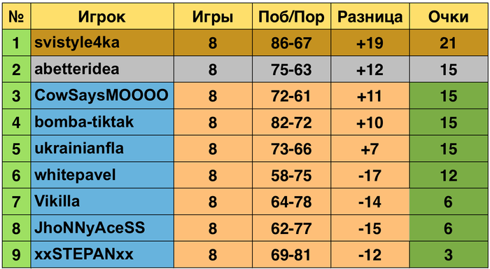 И все-таки нет, снова интрига. Bomba-tiktak у меня выиграл, и у нас с ним одинаковый результат по встречам в группе набравших по 15 очков, хотя я выиграл на 2 раунда больше. В общем, я предложил сыграть решающий матч - начинаем.