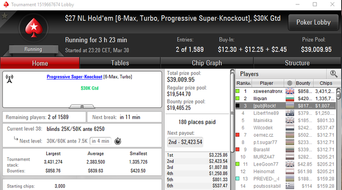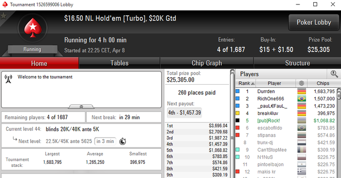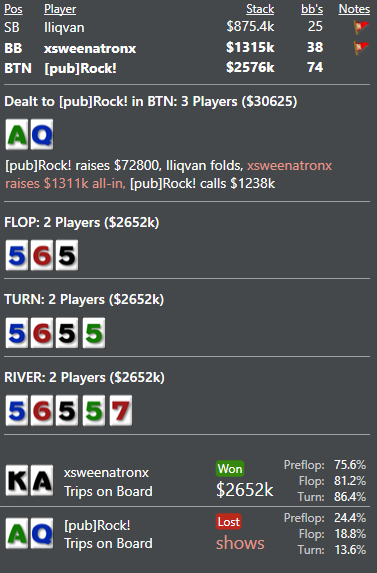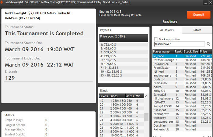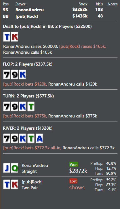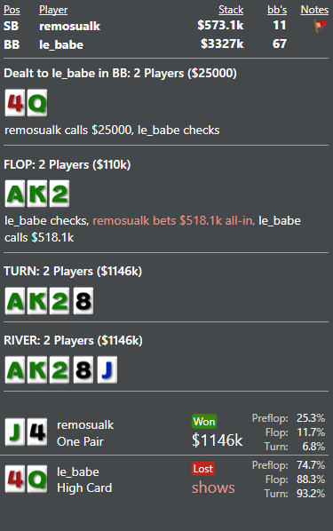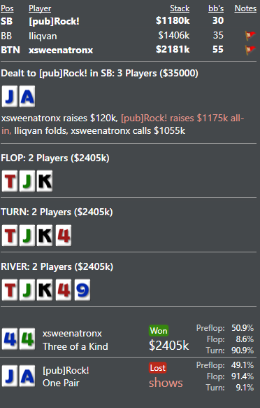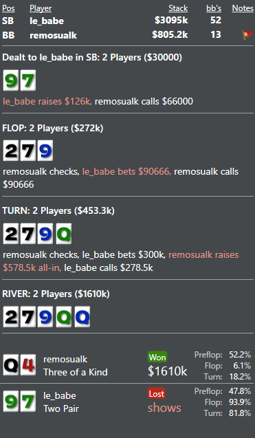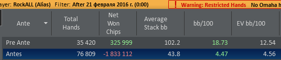Вытащил месяц со дна... Правда сделал по всей видимости 2 ошибки в 3максе с двумя слабыми, которые играли 3макс 25/20 или что-то тип того... Очень пассивно короче они играли и в пуше у этого оппа я видел только натсы. Рас:
