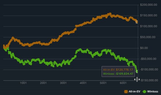 Это анте $50-$100. Недобор вполне реальный – 30 стэков по 100 анте. Но слишком уж быстро его навалило. При этом на графике явно слишком много ЕВэхи! Ее я перебрал. Все было бы куда более плачевно, если ЕВ в ноль, а недобор такой же. Нужно бежать со всех ног, чтобы только оставаться на месте. Качайте скилл и спите спокойно.