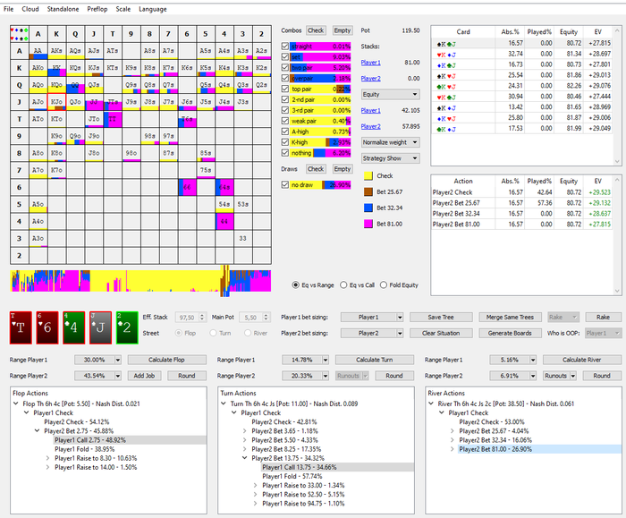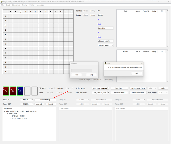 Здравствуйте! давно использую Simple postflop в рассчетах. Интересует возможность рассчетов, когда бы я мог не сидеть сутки за компом. Быть может есть возможность задать несколько досок для рассчета!?? Предположим я хочу посчитать доски БУ_ББ СРП (флоп) от 222 - до 999 за сайз 1\2 пота с одинаковой реакцией на этот рейз от ББ и т.д.? при этом я понимаю, что вряд ли такое возможно, однако необходимость оптимизации времени и работы в целом задает этот запрос. Вдруг есть это возможность, а я о ней не знаю.