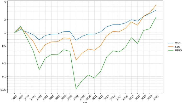 Читая блог Игоря, меня убедили аргументы в пользу UPRO, применительно лично ко мне. В начале 2022 переложился из VOO в UPRO почти на всю котлету (теперь это уже шестизнак). Закупился UPRO я на all-time-high прямо перед обвалом из-за войны (UPRO порядка 65% терял на пике), а в 2025 тоже была приличная просадка когда Трамп пошлины начал вводить.