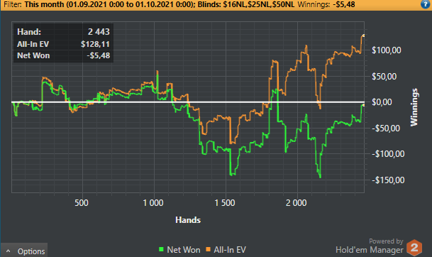 В июне 2018 года я играл нл16 и умудрился сыграть месяц в ноль (по ев +300), после чего бр чуть просел и пришлось спуститься на нл10, где я отыграл весь июль тоже в 0 (по ев +300), после чего пришлось снова спускаться еще ниже и я психанул, решив спуститься ниже некуда - на нл2. Я решил что если и нл2 не смогу побить, то нахер покер. В итоге за 2 недели августа я сыграл нл2 в 0 (по ев +100).