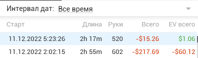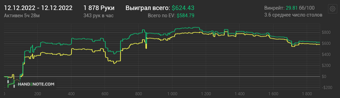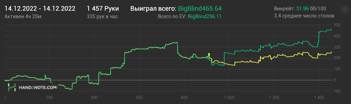 Загадка природы, конечно, почему качество игры распределяется настолько неравномерно по дням. Вчера как будто все наши дорогие БРАТЬЯ любители вместе смотрели игру Мэсси и затем дружно пошли за столы. А несколько дней до этого вообще было шаром покати. Да и сегодня как будто рекордно низкое кол-во рук в час) Походу снова в солвере играть буду больше, чем за столами