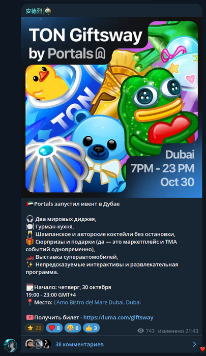 Я увидел пост в телеграм канале, что самый крупный маркет телеграм подарков Portals проводит ивент в Дубае.