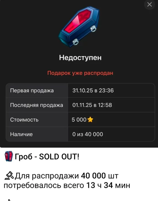 Подарки пошли выпускать по второму кругу, но самый главный позор в том, что гробы уже продаются более 10 часов, и около половины, до сих пор не раскуплены.