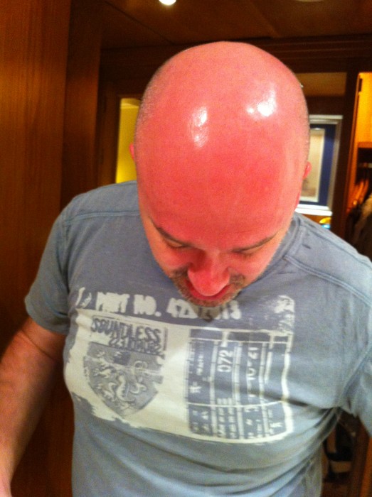 Причём я понял, что что-то не так только после обеда, когда почувствовал, как голову жжёт даже под зонтиком. Вообще-то, выглядит всё на (этой) фотке ещё страшнее, чем на самом деле, но всё равно понадобилось пару холодных душей и четверть банки геля с ликодеином и алое, чтобы предотвратить возможно более неприятные последствия.
