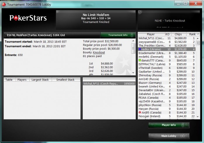 Вчера решил сыграть Saturday Duel (ХА за $11) на ПС, и из-за этого замазался в 5-6 турбин, проходивших в это время. Результат оказался неплохим: 50е в Дуэли (из-за чего поспал всего 6 часов), 20-е в Hot $75, и 3-е в $4.40 турбо