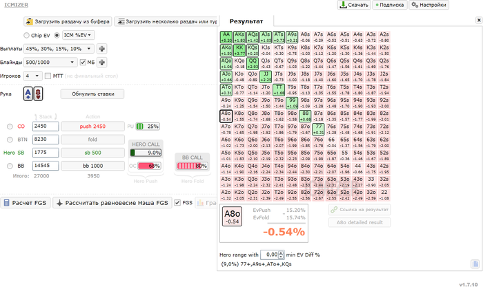 Здравствуйте! Либо от особенностей подсчета программой, либо от не правильных моих суждений у меня такой вопрос: Почему такая большая разница у A8o между FGS и не FGS подсчетом? Ведь в этой раздаче либо CO удваивается, либо вылетает. И это вроде должно быть важнее, чем то, у кого будет в следующей раздаче ББ, следственно и разница в FGS/не FGS должна быть не значительна. Или где-то я ошибаюсь?