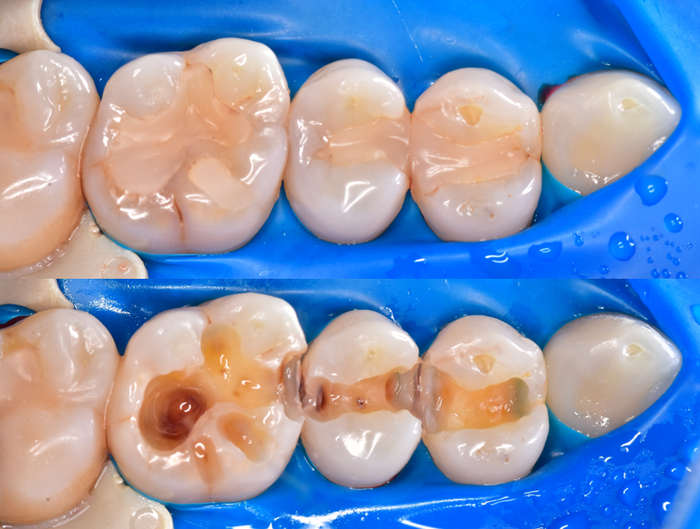 С живыми зубами проще, как только там образуется кариес (под пломбой) зуб начинает болеть и вы идете к стоматологу, и вам меняют пломбу и убирают кариес.
