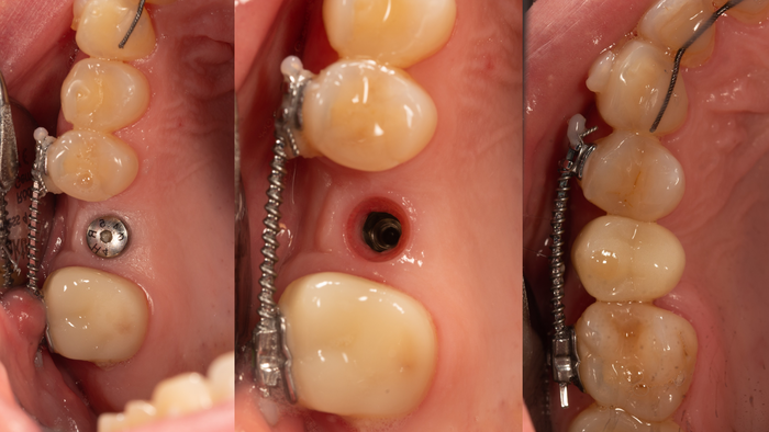 Все время, пока приживается имплант вы ходите с формирователем десны (металлической шайбочкой) которая обеспечивает доступ к импланту, и когда приходит время, эту шайбочку меняют на коронку