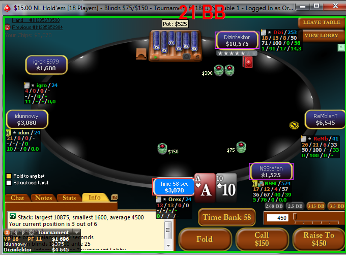 Дизинфектор неплохой рег этих турниров, агрессивный, сбалансированный. конкретно против него и конкретно в этой ситуации я сыграл бы через кол, но опять же, неиграбельая рука, нету позы.. думаю 3-бет пас норм